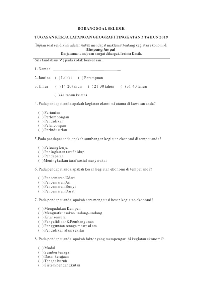 Pak Agus adalah seorang penjual sembako. Contoh borang soal selidik tugasan geografi pt3 2015 kegiatan ekonomi. Borang soal selidik atau temubual merupakan satu borang yang disediakan dengan pengisian beberapa soalan serta ruangan untuk responden menjawab soalan dan permaslahan yang ditanya.